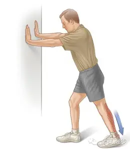 面向墙壁,双手放于墙上和双眼同高。没有受伤的腿放于受伤下肢前面约30-45厘米。保持受伤下肢伸直,足跟紧贴地面。慢慢弯曲前面的膝关节。向前倾斜上身直至小腿感到拉紧。保持30-60秒,回到原来姿势并重复3次。