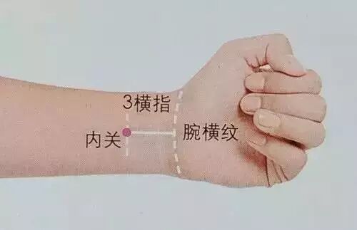 用手指按摩 内关穴。内关穴位于手腕内侧距手掌约6~7厘米处(如图),用拇指按压内关穴数分钟至有酸胀感,即可消除打嗝。