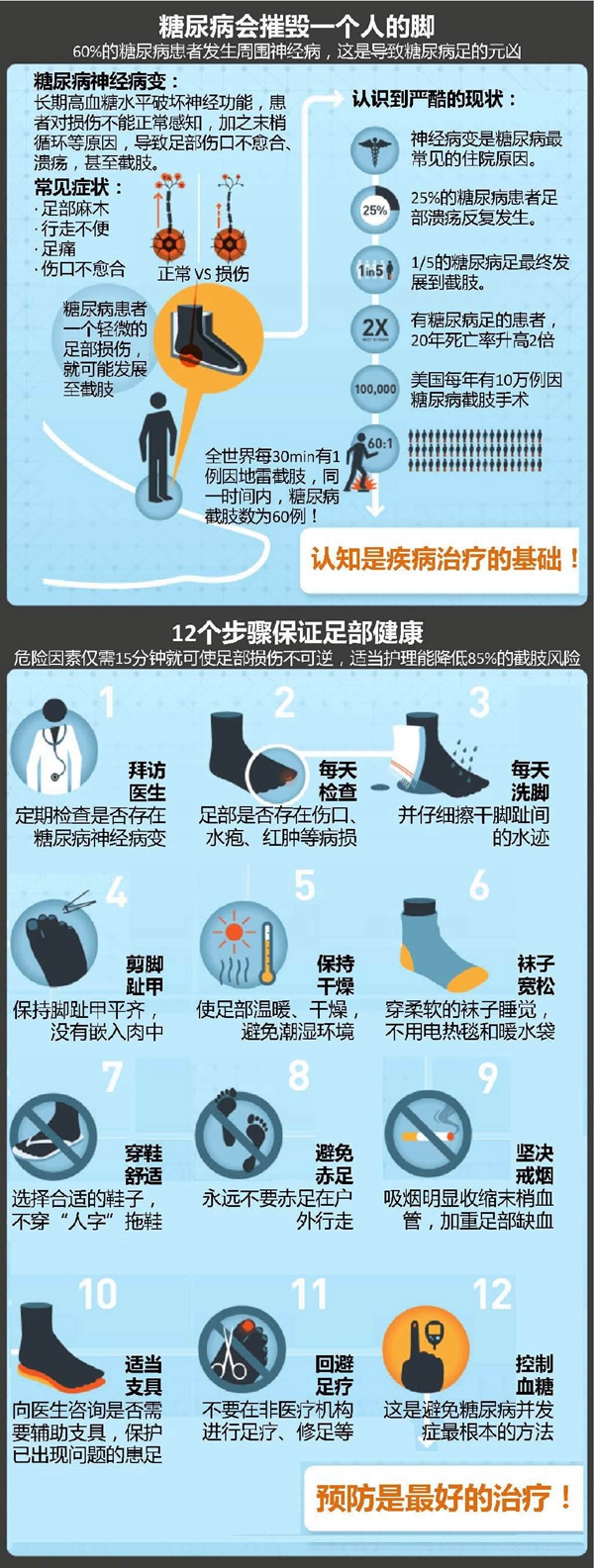 1.糖尿病患者一定要控制好自己的血糖、血压、血脂、血黏度,这是预防糖尿病足的根本。
