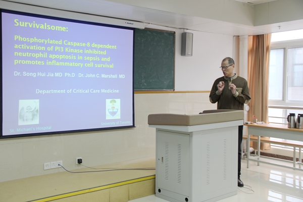 Jia Song Hui教授是国际知名的临床医学基础试验研究方面的专家,主要从事脓毒症相关研究。这次来访我院也不吝赐教,给大家带来了一场题为“Survivalsome: Phosphorylated Caspase-8 dependent activation of PI3 Kinase inhibited neutrophil apoptosis in sepsis and promotes inflammatory cell survival”的精彩学术演讲。他把自己在脓毒症方面的研究成果,毫无保留地介绍给大家;还结合自己的工作经历,和大家分享了他对于如何做好临床科学研究的想法和体会,给在场听课的医务人员提供了许多有益的启发。