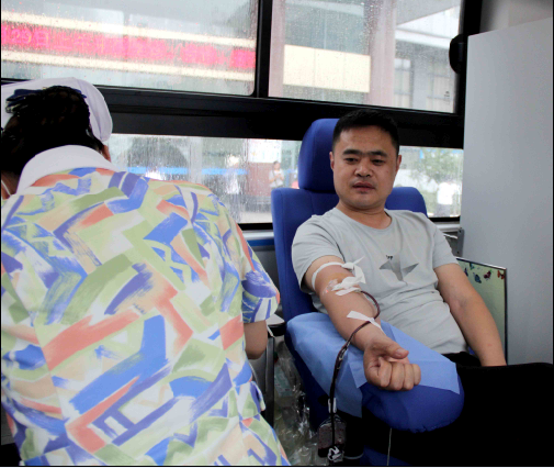 采血车上,一条条臂膀伸出来,一汩汩带着体温的热血流进储血袋,形成了一道别样的风景。献完血的党员职工高兴地举起红红的献血证合影留念,记录下这光荣而难忘的一刻……