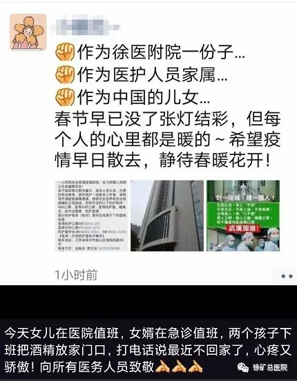 现在回想起来,那一夜其实我们并不孤单,有矿总院各位领导及以赵杰主任为首的专家组为坚实后盾,他们时时刻刻都在支持着我们。从开始到现在的每一夜,我们都不孤单,为了明确一个病人的病情,为了维护这一方水土免受疫情侵袭,各位专家在群里有过无数次通宵达旦的讨论,指导着我们以最正确,最安全的方式处理疫情。因此,发热门诊工作至今,虽有危险,心里却倍感踏实,我们也心甘情愿的为抗击疫情贡献着自己的微薄之力。