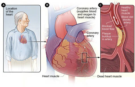 图A:心脏的位置。图B:冠状动脉损害造成急性心肌梗死引起的心脏病发作。图C:冠状动脉斑块形成血凝块。