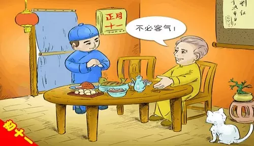 正月十一是“子婿日”,是岳父宴请女婿的日子。初九庆祝“天公生日”剩下的食物,除了在初十吃了一天外,还剩下很多,所以娘家不必再破费,就利用这些剩下的美食招待女婿及女儿,民歌称为“十一请子婿”。