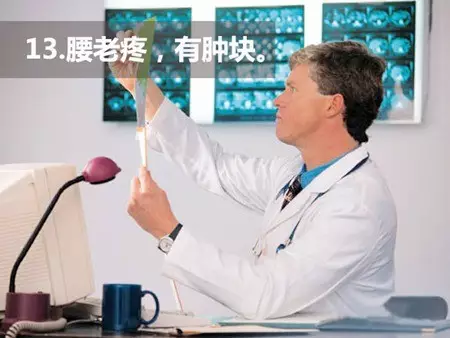 13.腰老疼,有肿块。肾脏位于后腹腔,空间很大,与此相关的疾病早期不容易发现。如果发现血尿、腰部疼痛、腹部有肿块,就要小心是肾脏癌,应尽快做进一步检查。