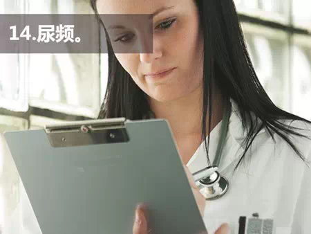 14.尿频。美国癌症学会指出,女性有下腹肿胀、闷痛、骨盆或腹部疼痛、很快就有饱足感、尿频与尿急,几乎每天出现其中一种症状时,应快速就医。另外,肿瘤有时可能会压迫大肠,因此若排便习惯有改变,也是警讯之一。
