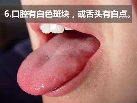 6.口腔出现白色斑块,或者舌头出现白点。黏膜白斑病久拖不治,容易发展为口腔癌。