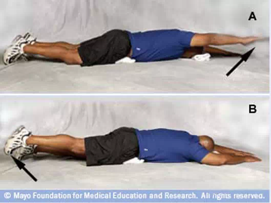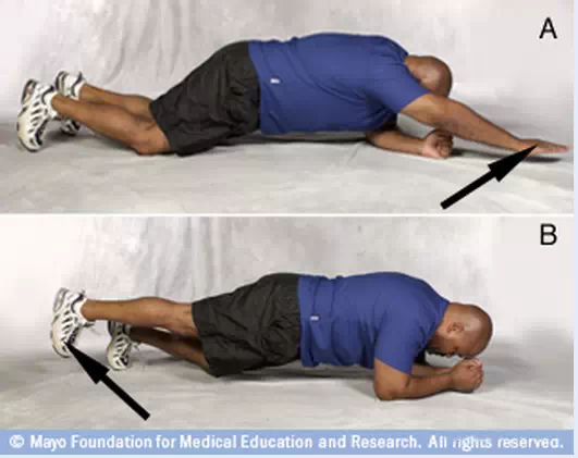A:俯卧,在腰部和额头各垫一毛巾或小枕头,手掌脚尖着地,腹部肌肉用力;平行伸出右侧手臂,坚持3个深呼吸,收回,换另一侧手臂重复动作;