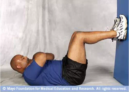 双脚蹬在墙面:髋膝关节弯曲均为90°,双手交叉抱于胸前,收紧腹部肌肉,抬起头、颈、肩部,坚持3个深呼吸,休息,再重复;