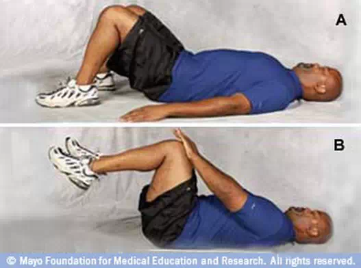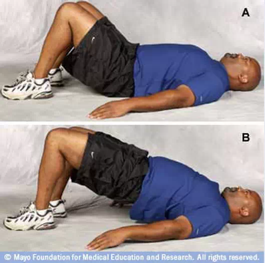 膝关节弯曲自然躺下,收紧腹部肌肉;将臀部抬起,使得膝关节、臀部、肩部在一条直线上,坚持3个深呼吸,休息,再重复。