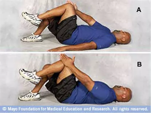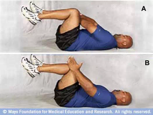 A:手臂伸直,双手交叉掌面握住对侧膝关节,双膝关节向内、双手向外做对抗运动,坚持3个深呼吸。