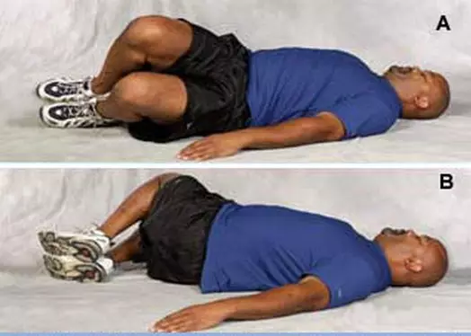 A:自然平躺抬起一侧膝盖,对侧手臂伸直,从侧面做对抗运动,坚持3个深呼吸,换腿;