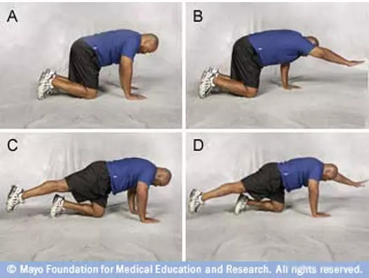 A:跪立,保持前臂与肩膀垂直,髋膝关节呈90°,头、颈、后背在一条直线上,身体平衡后,向前平行伸出一侧手臂,坚持3个深呼吸;然后收回,换另一只手臂;向后平行伸出一侧大腿,坚持3个深呼吸;然后收回,换另一条腿;动作熟练后,分别伸出对侧的手臂与大腿,坚持3个深呼吸,然后收回,换另一组;