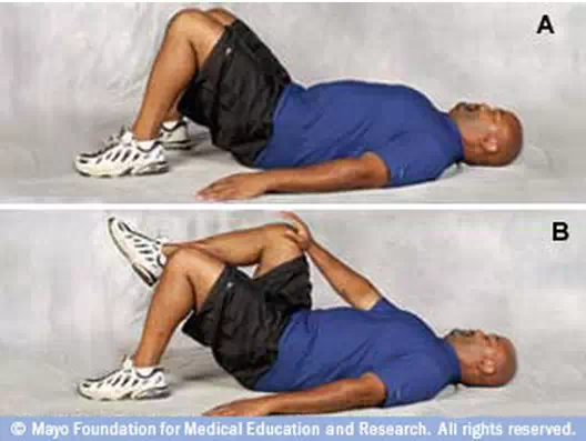 膝盖弯曲,自然躺下;一腿抬起,使髋膝关节呈90°,将手置于膝上,与膝关节做对抗运动,保持手臂垂直,坚持3个深呼吸;习惯后可同时抬起双腿,做对抗运动;