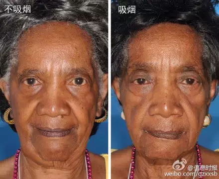▲左边这位是个老烟民,右边不抽烟。左边眼睛无神,眼尾纹多到吓人,面色无光,牙齿黑黄。看起来比右边老了20岁!