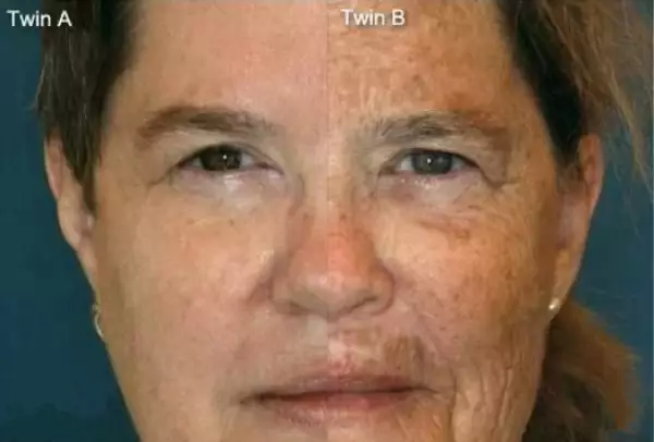 ▲差异极大的一组。右边的吸烟者头发干枯,面部长满斑点,眼睛比左边无神多了。更别提额头、嘴角、颈部深陷的纹路了。