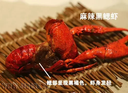 正规渠道养殖的健康小龙虾,形状完整,个头均匀,头和身子几乎各占一半,颜色红亮干净,腹毛、爪毛干净,腹白。来自被污染水域的小龙虾,大小不匀,脑袋大身子小,颜色褐红或铁红,关节处较脏,腹部毛脏,头部有污物,或是寄生虫。就目前的生长环境状况来看,野生的小龙虾被污染的几率要大一些。看熟后形状,在餐馆吃做好的小龙虾时,如果发现龙虾的尾巴是直的,那么这些龙虾在下锅之前已经是死虾了。如果是弯曲的,蜷缩着身体的,肉质比较紧密有嚼劲的,就表示是活虾做的,可以吃。