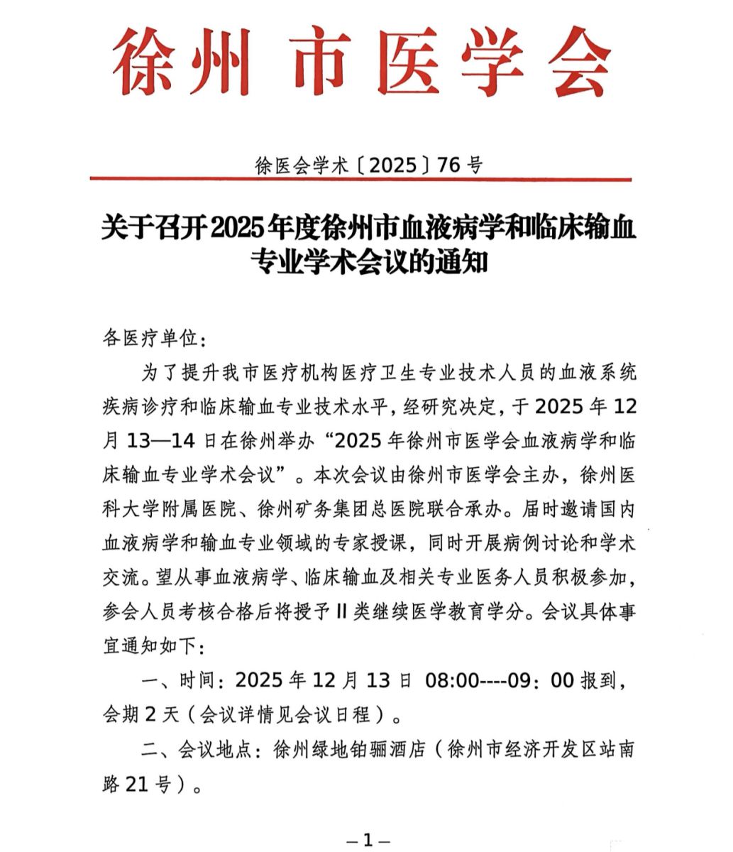 为了提升我市医疗机构医疗卫生专业技术人员的血液系统疾病诊疗和临床输血专业技术水平,经研究决定,于2025年12月13—14日在徐州举办“2025年徐州市医学会血液病学和临床输血专业学术会议”。本次会议由徐州市医学会主办,徐州医科大学附属医院、徐州矿务集团总医院联合承办。届时邀请国内血液病学和输血专业领域的专家授课,同时开展病例讨论和学术交流。望从事血液病学、临床输血及相关专业医务人员积极参加,参会人员考核合格后将授予Ⅱ类继续医学教育学分。会议具体事宜通知如下: