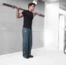 双手举一根横杆置于胸前,下蹲,数到10,迅速起身。做三组,每组4-6下。高级别者可握20磅重的杠铃。