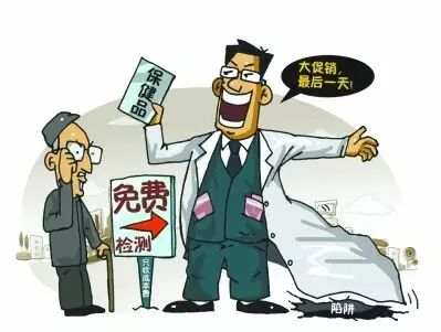 一些推销人员假扮医务人员给老人体检,夸大老人病情,趁机夸大产品功效。
